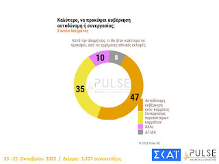 Η σχετική πλειοψηφία των ερωτηθέντων (στο σύνολο του δείγματος) , σε ποσοστό 47% θεωρεί ότι είναι καλύτερο από τις εκλογές να προκύψει αυτοδύναμη κυβέρνηση ενός κόμματος. Κυβέρνηση συνεργασίας προτιμά το 35% των ερωτηθέντων.