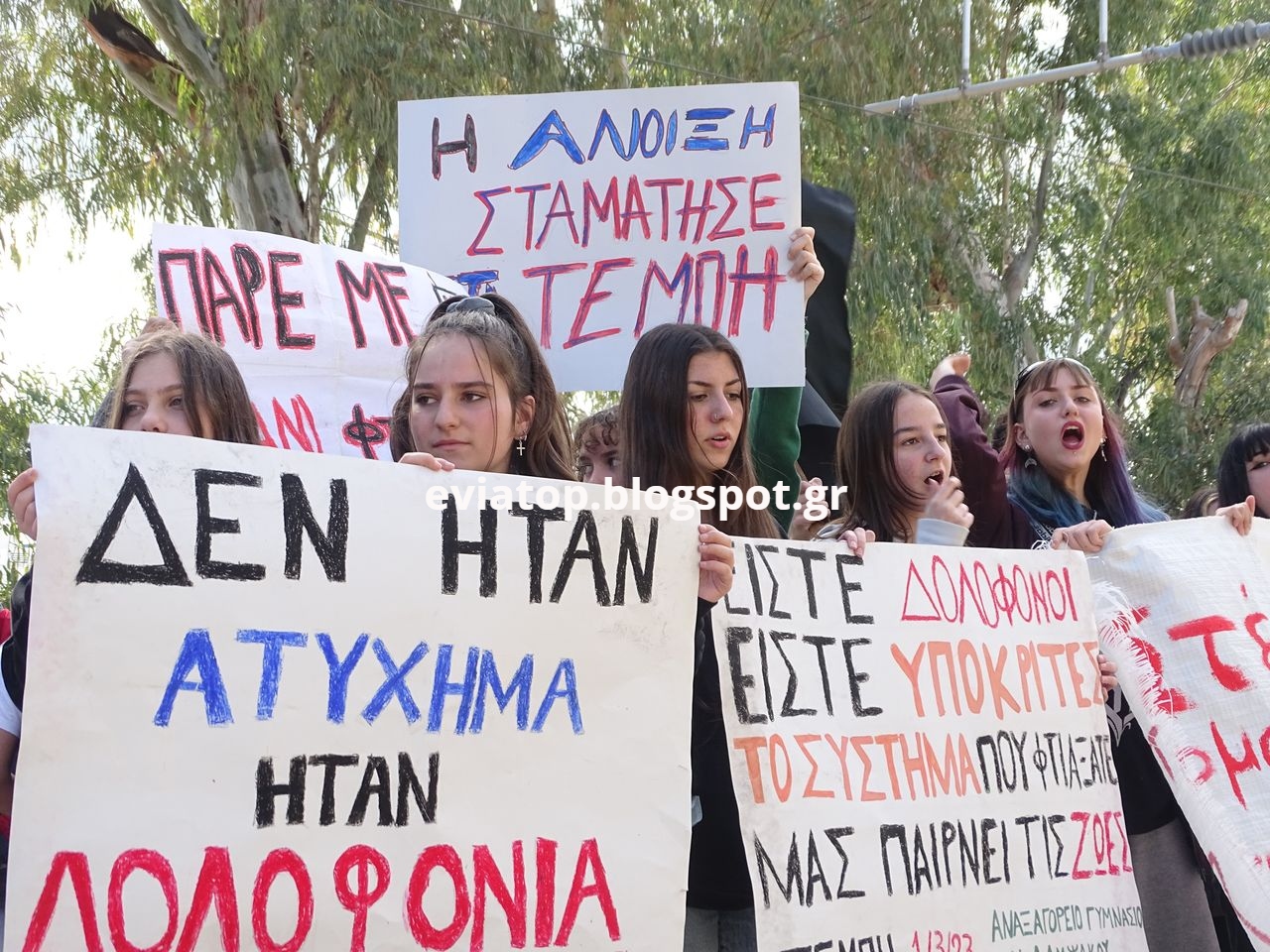Τον τόνο όμως έδωσαν τα νιάτα της πόλης. Μαθητές και φοιτητές, που δεν σταμάτησαν λεπτό να φωνάζουν συνθήματα όπως, «Όλων των νεκρών γινόμαστε φωνή, η νέα γενιά δεν σας συγχωρεί», «Στείλε όταν φτάσεις. Δεν έφτασε ποτέ! Εκδίκηση θα πάρουμε για σένανε μικρέ!», «Το σύστημά τους με αίμα ποτισμένο... ποτέ δεν θα ξεχάσουμε το έγκλημα στο τρένο!».